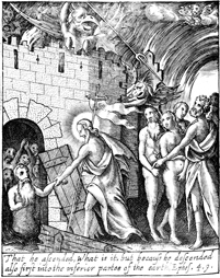 Description: Jesus descends from heaven and performs the final resurrections. Men and women surround Jesus while mythical creatures are situated above him. Ephesians 4 appears at the bottom.