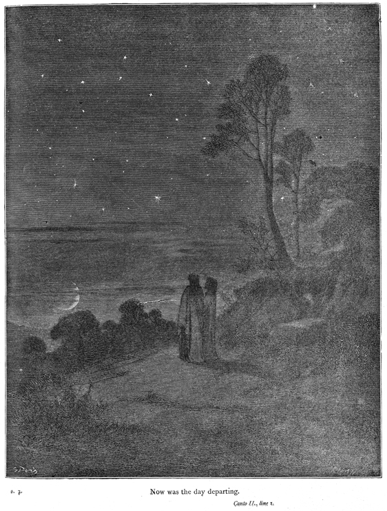 Description: Dante stands with his guide in a clear plateau, free at last from the dangers of the gloomy wood that plagued him in the first Canto. The starry sky and rising moon tell us that it is now nightfall, and that Dante’s journey through the gloomy wood took an entire day. As he looks forward, he contemplates his journey and steels himself for the perils ahead. The engraver, Héliodore Pisan (1822-1890), has placed his signature at the bottom right, while the artist Gustave Doré (1832-1888) has placed his signature at the bottom left.