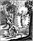 Description: A sword bearing angel expels Adam and Eve (along with the serpent) from the Garden of Eden after eating the forbidden fruit.