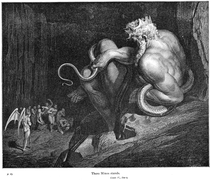 Description: Plato tells us that Minos, former King of Crete and keeper of the famous Labyrinth, judged the souls of the dead in conjunction with two other mythical kings, Rhadamanthus and Aeacus. Virgil and Dante encounter Minos in this function as they prepare to enter the next circle of Hell. Although the text has him standing, Doré has chosen to portray him at such a large scale so as to highlight the power he has over the souls begging for mercy before him. The engraver, Gaston Raymond Ernest Monvoisin (19th c.), has placed his signature at the bottom right, while the artist, Gustave Doré (1832-1888), has placed his signature at the bottom left.