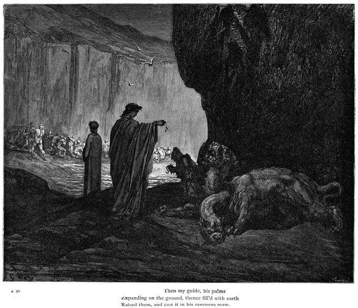 Description: Cerberus, the three-headed canine guardian of the underworld from classical mythology, is here transformed by Dante into a demon in the third circle of hell, that of gluttony. Virgil is shown casting dirt into the ravenous creature’s mouth to trick him into letting them pass. The engraver, Antoine Alpheé Piaud (active 1837-1866), has placed his signature at the bottom right, while the artist Gustave Doré (1832-1888) has placed his signature at the bottom left.