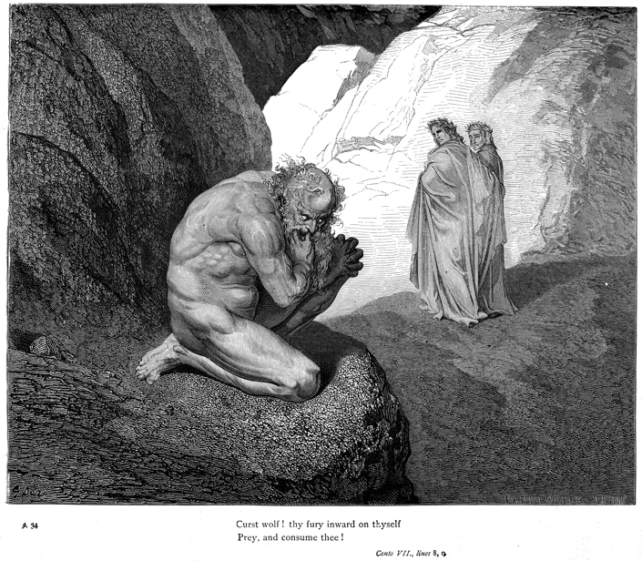 Description: Virgil and Dante encounter Plutus, a god of wealth here downgraded to a demon and guardian of the fourth circle. Virgil admonishes the ‘Curst Wolf,’ shown here with claw-like fingernails and an animalistic face, to stop hindering their progress. The engravers, Stéphane Pannemaker (1847-1930) and Ad Ligny (active 1855-1876), have placed their signatures at the bottom right, while the artist Gustave Doré (1832-1888) has placed his signature at the bottom left.