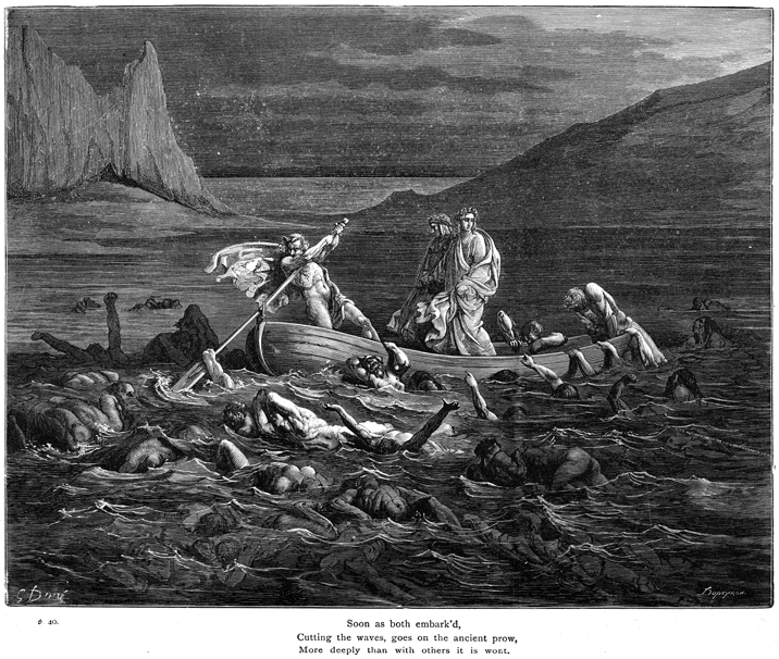 Description: Dante and Virgil are ferried across the Styx by Phlegyas, a figure from Classical myth that burned the temple of Apollo at Delphi after the god ravaged his daughter. Filippo Argenti, a fellow Florentine, attempts to pull himself into the boat even as Phlegyas fights off other enraged souls with his oar. The engraver, Bonnet Dupeyron (19th c.), has placed his signature at the bottom right, while the artist Gustave Doré (1832-1888) has placed his signature at the bottom left.