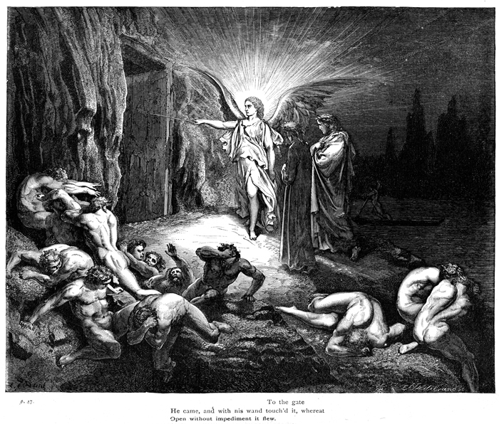 Description: Dante and Virgil are assisted by an angel, who has arrived via the ferry in the background to open the gate to the city of Dis. The damned souls that sought to deny them entrance cringe away from the angel’s heavenly presence as he opens the door with a touch of his wand. The engraver, Henri Théophile Hildebrand (1824-1997), has placed his signature at the bottom right, while the artist Gustave Doré (1832-1888) has placed his signature at the bottom left.