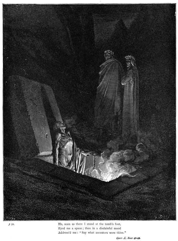 Description: Dante and Virgil are addressed by one of the heretics, who reveals himself to be Farinata of the noble Uberti family. Farinata was the leader of the Imperialist (Ghibeline) party in Florence before Dante was born. The erect posture in which he holds himself communicates his disdain for those around him. The engraver, Héliodore Pisan (1822-1890), has placed his signature at the bottom left, while the artist Gustave Doré (1832-1888) has placed his signature at the bottom right.