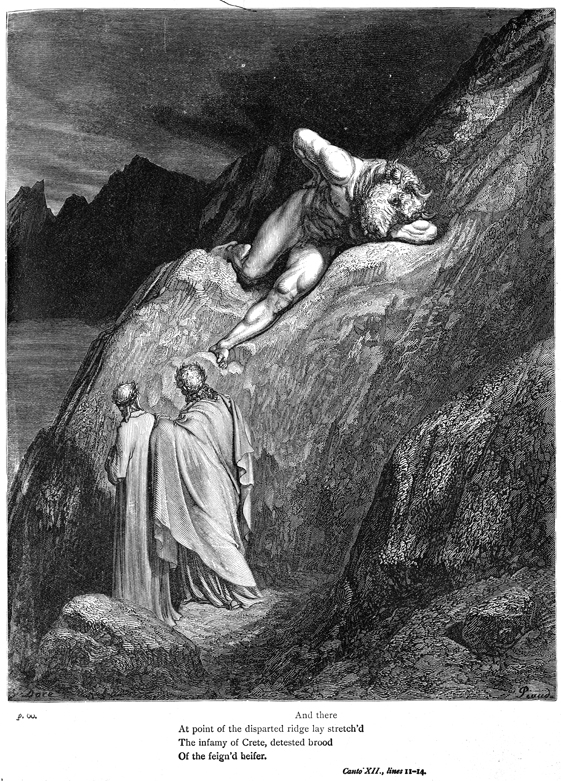 Description: Virgil and Dante happen upon the Minotaur, that famed beast of Classical myth born of the Queen of Crete, Pasiphae, and a white bull. He functions here as the guardian of the entrance to the seventh circle, where the violent reside. Virgil urges Dante on with a push of his hand, lest the Minotaur hinder them. The engraver, Antoine Alphée Piaud (fl. 1837-1866), has placed his signature at the bottom right, while the artist Gustave Doré (1832-1888) has placed his signature at the bottom left.