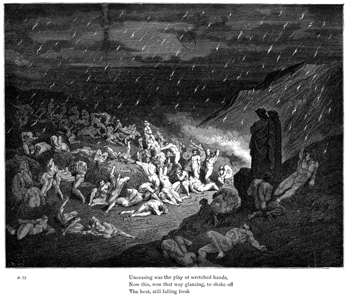 Description: As they leave the Wood of Suicides Dante and Virgil pause at the edge of a barren plain populated by the souls who committed violence against God or nature. These souls are continuously pelted with embers, like snowflakes, falling from the sky. The engraver, Gaston Raymond Ernest Monvoisin (19th c.), has placed his signature at the bottom right, while the artist Gustave Doré (1832-1888) has placed his signature at the bottom left.