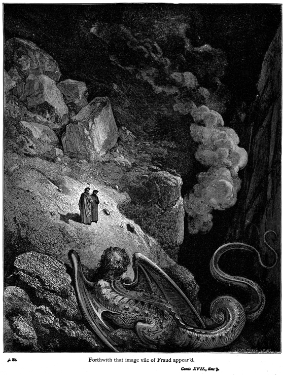 Description: We are afforded a bird’s eye view of Dante and Virgil, who are dwarfed by the landscape which slopes sharply into the next area of Inferno. The foreground of the engraving is occupied by the serpentine Geryon, a monster from Classical myth whom Dante has altered into the personification of Fraud and guardian of the eighth circle. He appears here as a great, reptilian beast with wings, a shaggy torso, and a human head. The engravers, Ad Ligny (active 1855-1876) and Stéphane Pannemaker (1847-1930), have placed their signature at the bottom right.