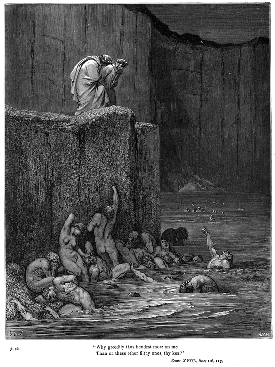 Description: Alessio Intermini of Lucca points to Dante and demands to know why he is being scrutinized above all others in this region of Inferno. This area of the Eigth Circle houses flatterers, doomed to wallow in excrement. The engraver, Héliodore Pisan (1822-1890) has placed his signature at the bottom right, while the artist Gustave Doré (1832-1888) has placed his signature at the bottom left.