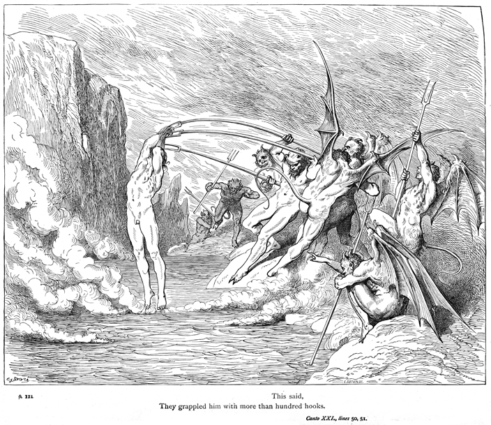 Description: This region of the Eighth Circle is reserved for barraters, the civic version of Simonites. They are tortured by demons with long forked weapons, the Malabranche, and left to suffer in pits of boiling pitch. The engraver, Noël Eugène Sotain (1816-1874), has placed his signature at the bottom right, while the artist Gustave Doré (1832-1888) has placed his signature at the bottom left.