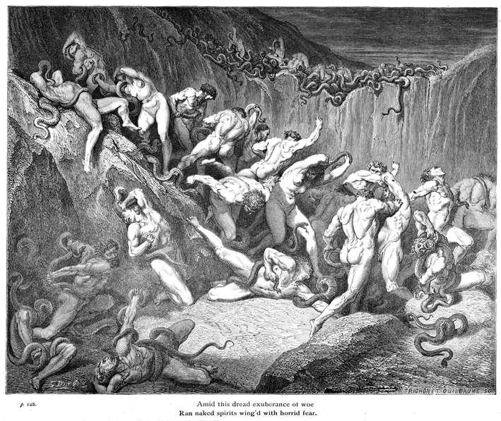 Description: This area of the Eighth Circle, reserved for thieves, is filled with every manner of snake. The souls condemned here are bound by the snakes and wither into ash when they are bitten, only to be reconstituted so as to continue their suffering. The engravers, Francois Auguste Trichon (b. 1814) and Joseph-Julien-Guillaume Dulompré (b. 1789) have placed their signature at the bottom right, while the artist Gustave Doré (1832-1888) has placed his signature at the bottom left.