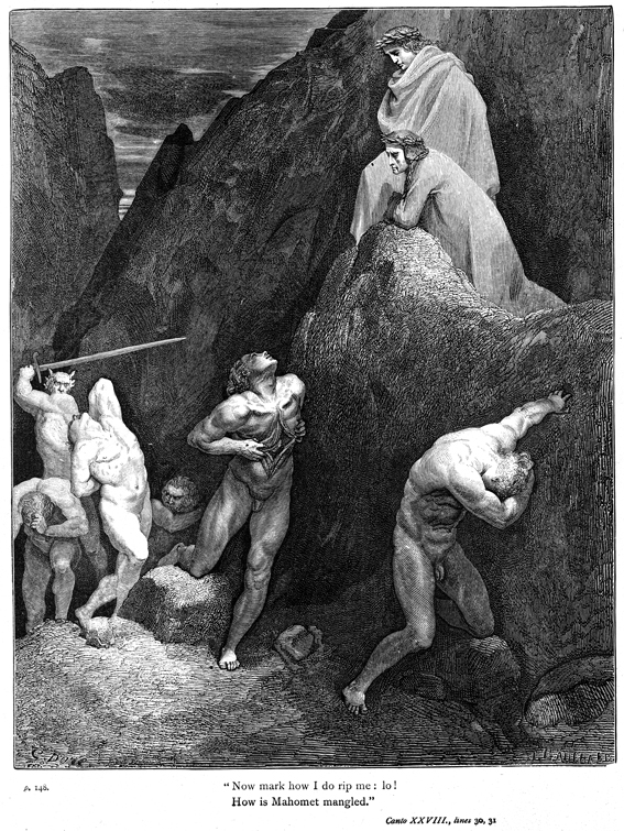 Description: Dante and Virgil encounter the Prophet Mohammed and 'Ali, accused of sowing dissent and thus condemned to this area of the Eighth Circle. Mohammad rips open the wound in his chest to display his entrails, even as the sword wielding demon behind him deals out the same punishment to others. The engraver, Felix Jean Gauchard (1825-1872), has placed his signature at the bottom right, while the artist Gustave Doré (1832-1888) has placed his signature at the bottom left.