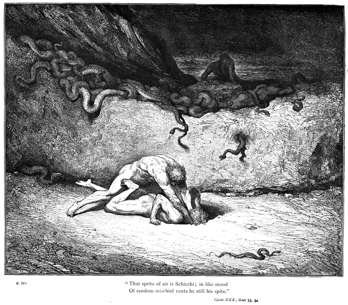 Description: The enraged spirit of Gianni Schicchi attacks Capocchio, driving his face into the ground. Schicchi allegedly impersonated a friend’s uncle for the purpose of drafting a better will. The engraver, Paul Riault (active 1852-1863), has placed his signature at the bottom right, while the artist Gustave Doré (1832-1888) has placed his signature at the bottom left.