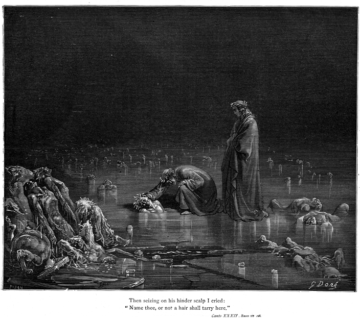 Description: When Dante accidentally steps on one of the frozen souls he asks to know the sinner’s name; the soul refuses to tell him and Dante resorts to threats. He is revealed to be Bocca degli Abati, a fellow Florentine who betrayed his party (the Guelphs) at a battle in 1260. The engraver, Héliodore Pisan (1822-1890), has placed his signature at the bottom right, while the artist Gustave Doré (1832-1888) has placed his signature at the bottom left.