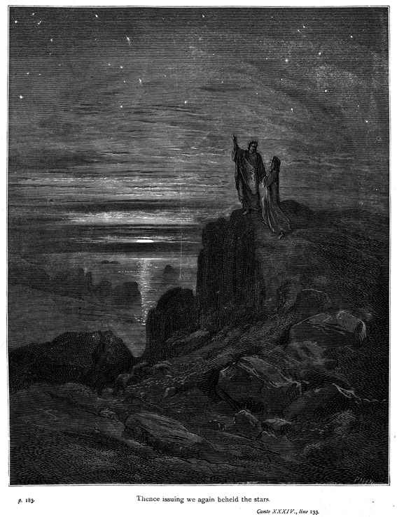 Description: Virgil, true to his word, has lead Dante safely through the perils of Inferno and now gestures to the stars above them, indicating that Dante’s trial (and the Inferno) are over. The engraver, Héliodore Pisan (1822-1890), has placed his signature at the bottom right.