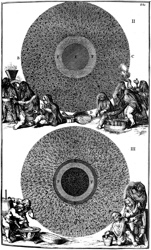 Description: A representation of the earth separating into land and water. The bottom image includes shows an additional layer of fluids as part of the separation process.