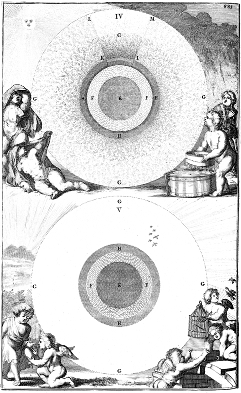 Description: The final separation of land and water (top) and a mythical explanation of a snowfall, as birds escape from heaven (bottom).