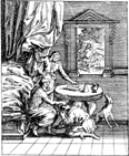 Description: Rebekah helps Jacob fool his father, Isaac, into giving him Esau’s blessing, while Esau is away hunting game (background).