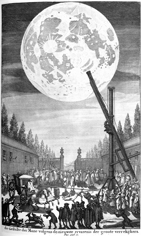 Description: A crowd gathers to see the moon through a large telescope, operated by a horse and carriage.