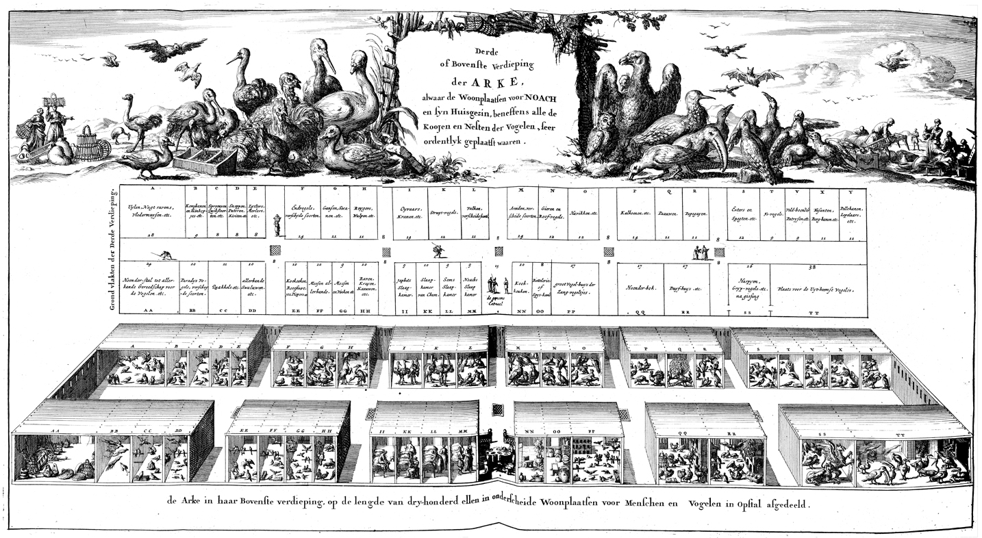 Description: A plan for the top level of Noah’s ark, where various types of birds and Noah’s family had quarters (top); a rendering of what the areas depicted on the plans might have looked like.