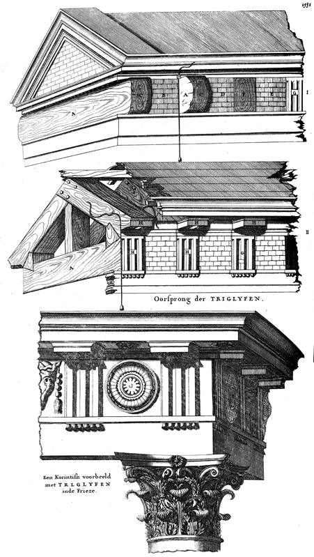 Description: Examples of triglyphs, vertically channeled tablets in a frieze, thought to represent the wooden beam ends in a primitive hut (top two images). The bottom image is a Corinthian example of triglyphs in a frieze.