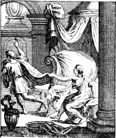 Description: As Potiphar’s wife attempts to seduce Joseph, he flees and leaves his tunic in her hand.