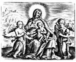 Description: A depiction of the Virgin Mary holding the infant Jesus. On her left is an angel holding grapes, and on the right is an angel with a harp.