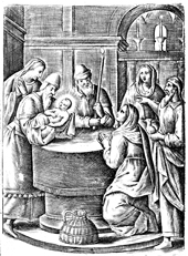 Description: A depiction of Mary and Joseph presenting the Infant Jesus Christ at the Temple. Simeon is shown blessing the child and Anna is shown offering Thanksgiving to God.