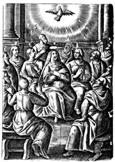 Description: A depiction of the Holy Spirit in the form of a dove descending upon the apostles as tongues of fire appear above their heads.
