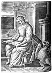 Description: A depiction of the disciple John writing with his attribute, the eagle, beside him.