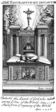 Description: A lamb lies on a Cross on top of an altar. Above, angels surround a crucifix.