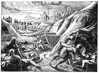 Description: David spares Saul’s life for the second time, taking his pitcher and spear.