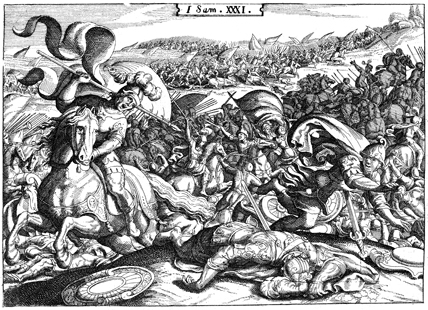 Description: Saul falls on his sword so as not to be taken prisoner by the Philistine army.