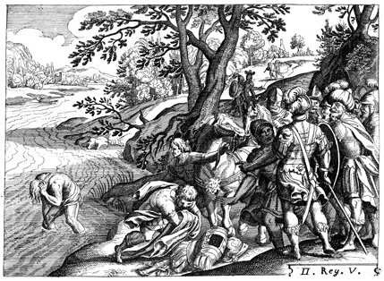 Description: Naaman is cured of leprosy by washing in the Jordan River seven times, as Elisha had commanded.
