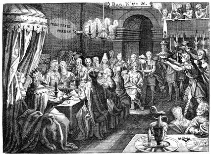 Description: During a banquet of King Belshazzar, a hand appears from a cloud and writes on the wall.
