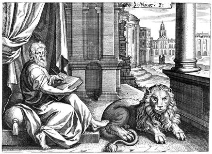 Description: Mark is depicted writing the Gospel of Mark with a lion at his feet.