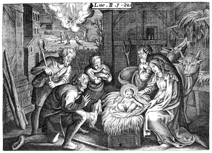 Description: A depiction of the birth of Jesus in a manger in Bethlehem surrounded by Mary and Joseph and shepherds.