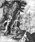 Description: Moses prepares to throw the tablets of the Ten Commandments down, as the people worship the golden calf.