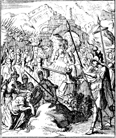 Description: The walls of Jericho begin to fall as the Israelites march around the city with the Ark of the Covenant and blow their trumpets.