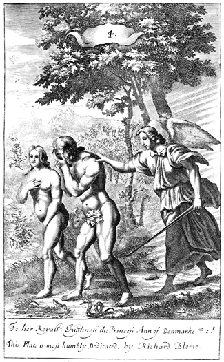 Description: Adam and Eve are expelled from the Garden of Eden. As the numeral at the head of the page indicates, this is plate #4 in a series of illustrations, and the engraver, Michael van der Gucht (1660-1725), is responsible for the work..