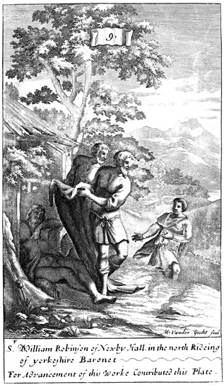 Description: Ham dishonors Noah by pointing out his nakedness, but Shem and Japheth cover their father with a sheet. As the numeral at the head of the page indicates, this is plate #9 in a series of illustrations, and the engraver, Michael van der Gucht (1660-1725), is responsible for the work..