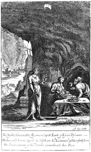 Description: Lot’s daughters seduce him after getting him drunk, as Sodom and Gomorrah burn in the background. In the distance, Lot’s wife has now become a pillar of salt after looking back toward the cities. As the numeral at the head of the page indicates, this is plate #17 in a series of illustrations. Additionally, the signatures of the artist, G. Freman, and the engraver, Johannes Kip (1653-1722), appear at the bottom..