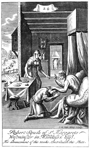 Description: Rebekah helps Jacob fool his father, Isaac, into giving him Esau’s blessing, while Esau is away hunting game (left). As the numeral at the head of the page indicates, this is plate #24 in a series of illustrations, and the artist or engraver’s name, Frederik Hendrik van den Hove (1628/29-1698), has been placed in the lower left corner of the woodcut.