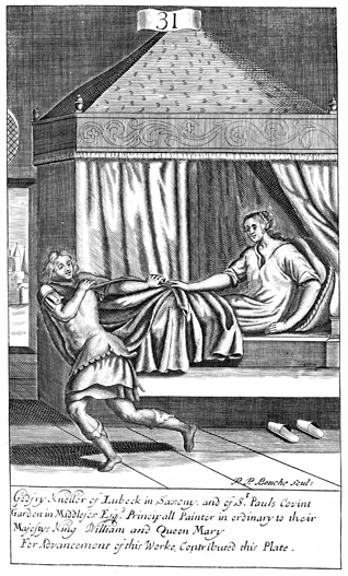 Description: As Potiphar’s wife attempts to seduce Joseph, he flees and leaves his tunic in her hand. As the numeral at the head of the page indicates, this is plate #31 in a series of illustrations, and the artist or engraver responsible for the work is Peter Paul Bouche (b. ca. 1646).