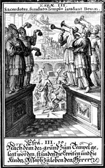 Description: The foundation for the Second Temple is laid, as the priests praise God with trumpets and the Levites with cymbals.
