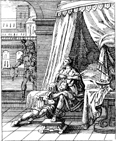 Description: Delilah cuts Samson's hair as he sleeps; Philistine soldiers wait to bind him in the background.