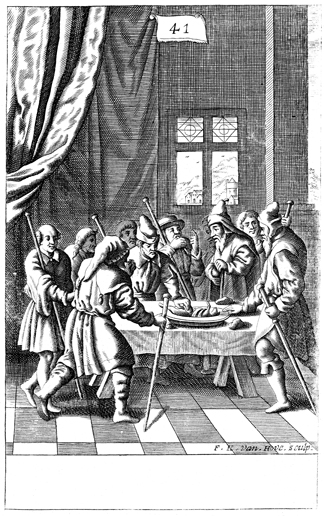 Description: Standing around the table with staffs in hand, Israelites eat the Passover meal.