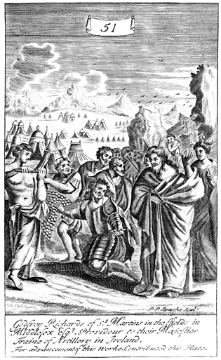 Description: Joshua and Caleb return from the exploration of Canaan and report to Moses of its abundance, indicated by the large size of the grape clusters they bear. As the numeral at the head of the page indicates, this is plate #51 in a series of illustrations, and the name of the engraver, Peter Paul Bouche (b. ca. 1646), has been set at the base.