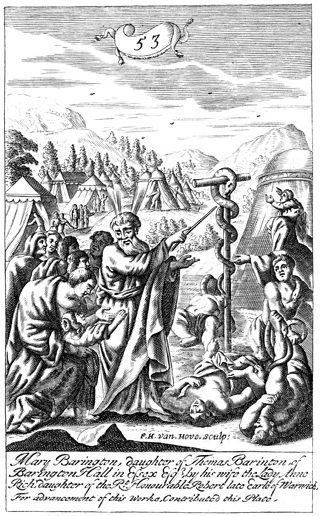 Description: Moses provides a bronze serpent that whoever looks upon it may survive the venomous snake bites. The name of the artist, Frederick Hendrick van Hove (1628-1698), has been set at the base, and as the numeral at the head of the page indicates, this is plate #53 in a series of illustrations.