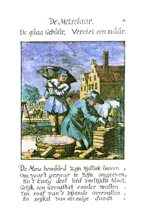 Description: A bricklayer is in the process of putting a brick into the wall he is building around a house. A worker, known as a hod-carrier, brings more mortar; in the background is a cement mixer. The Dutch artist and poet, Jan Luiken (1649-1712), was responsible for drawing this emblem and for creating the motto and poem that follow. Jan Luiken and/or his son Casper Luiken (1672-1708) were responsible for its etching. The attendant scripture text is Proverbs 4:23. Motto: The bad neighbor / Demands a wall. Poem: Man puts a wall around his temporary life, /To be surrounded in case of danger, / And the eternal part lies often exposed, /Like a border town without walls, /To be plundered by enemy’s attacks, / And threatened by eternal death. (Translation by Josephine V. Brown, with editorial assistance from William G. Stryker).